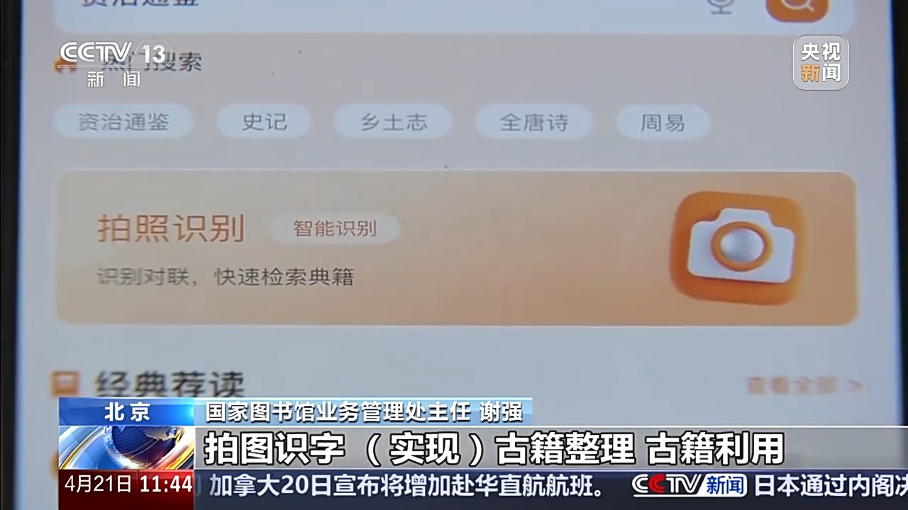 国家图书馆业务管理处主任 谢强:结合数字化发展趋势,拍图识字实现古籍整理、古籍利用。可以翻译晦涩难懂的句子,再定位到原文或者定位到话词检索,去了解更深层次的内容。