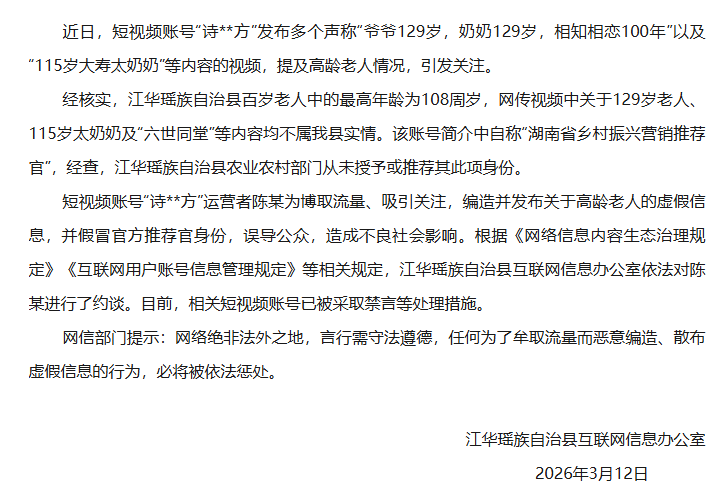 2026年3月12日,江华瑶族自治县互联网信息办公室发布通报,针对短视频账号编造发布高龄老人虚假信息一事开展核查处置,相关不实信息已被澄清。